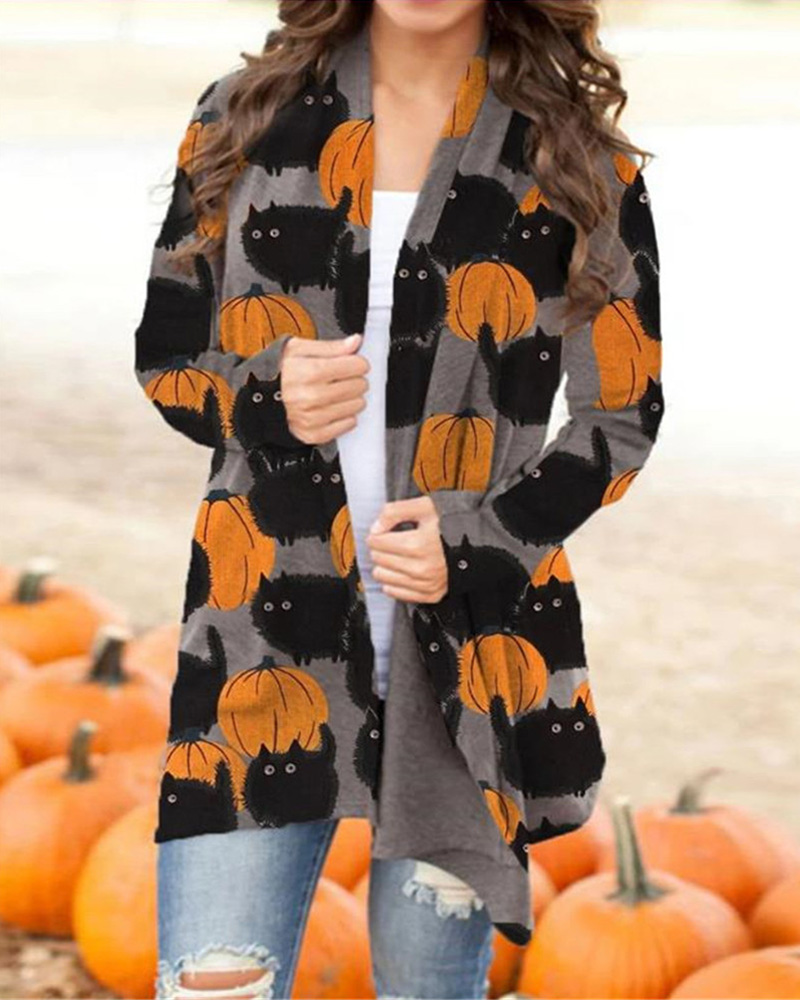 • Women's Halloween Costume Casual Cardigan Pumpkin Cat Ghost Long Sleeve Tops